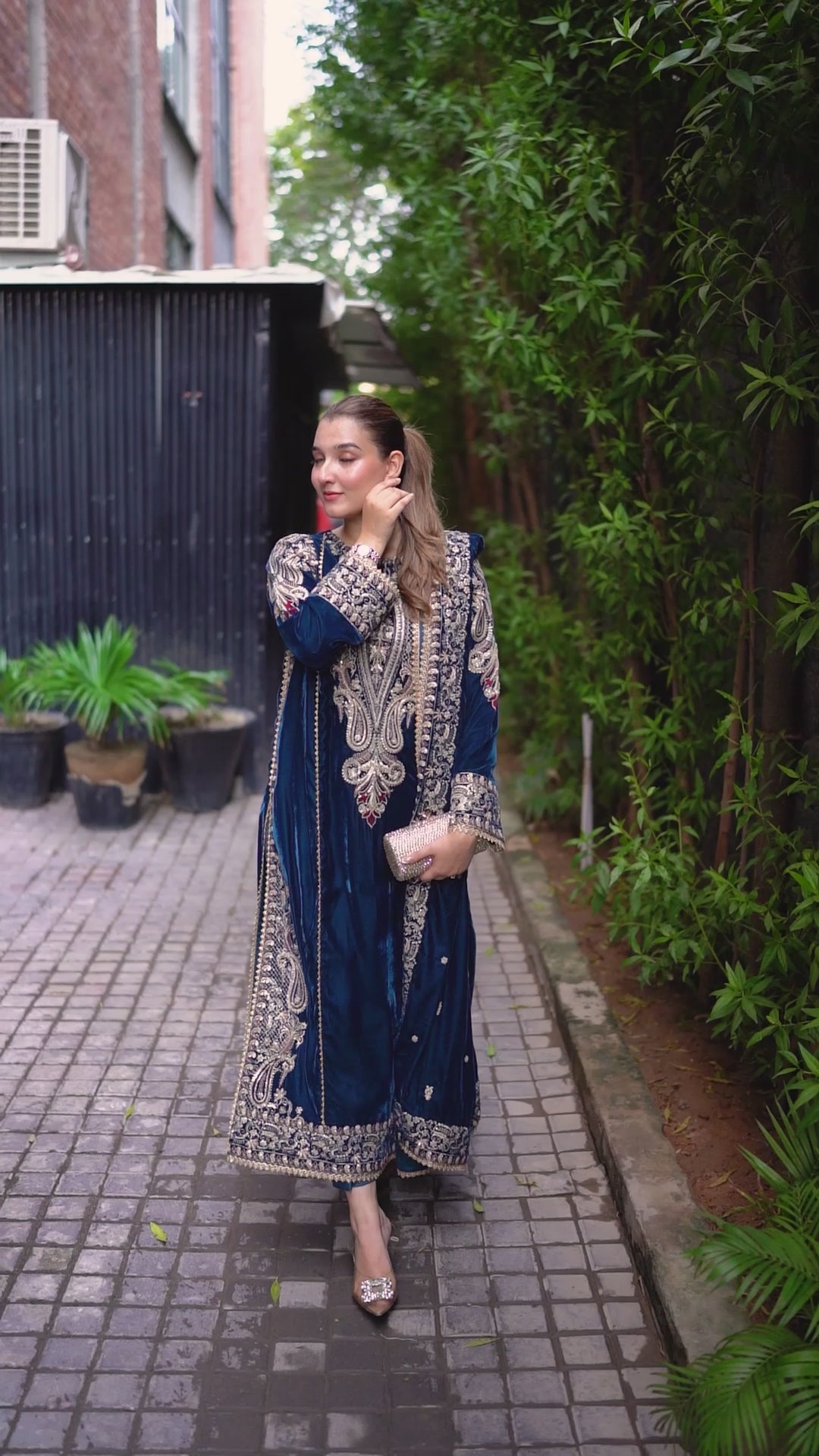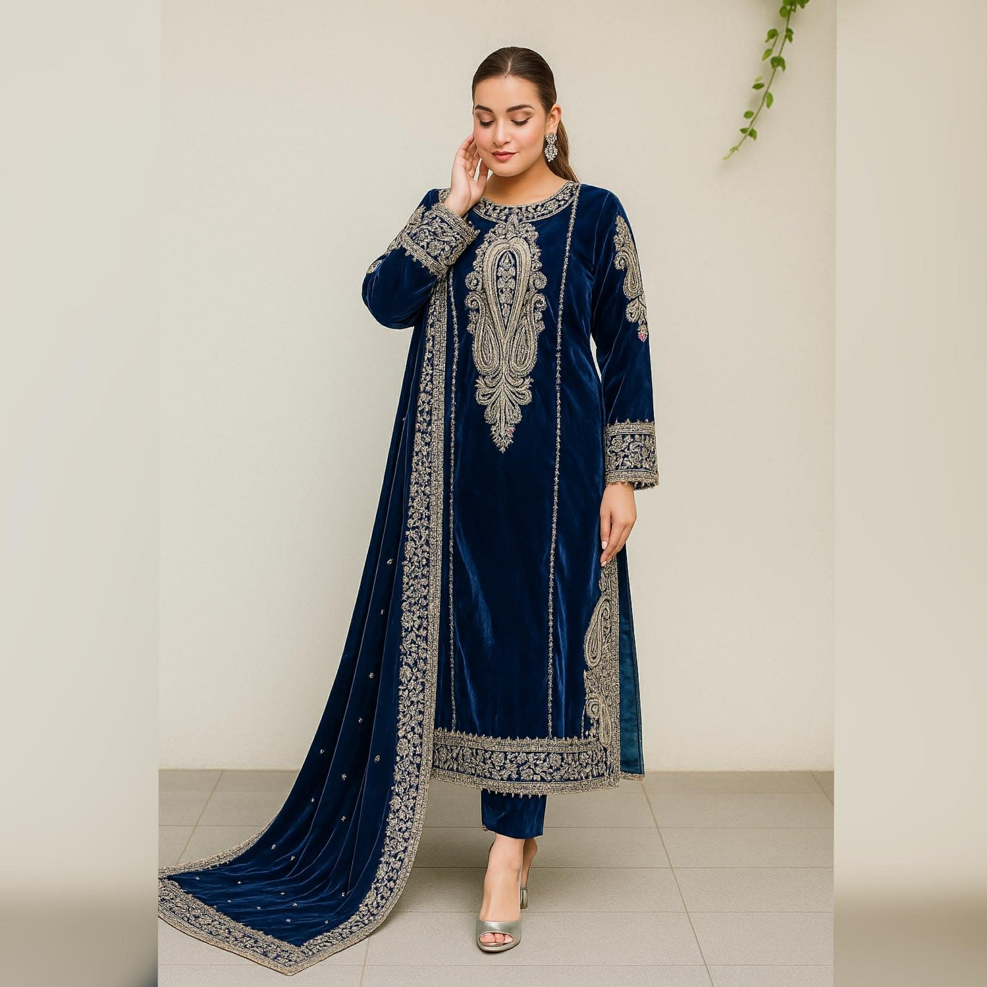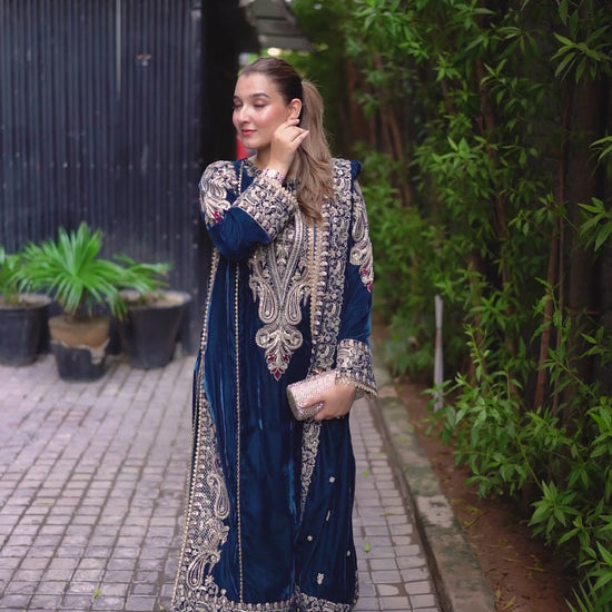 ANEELAS BLUE VELVET DRESS WITH VELVET SHAWL